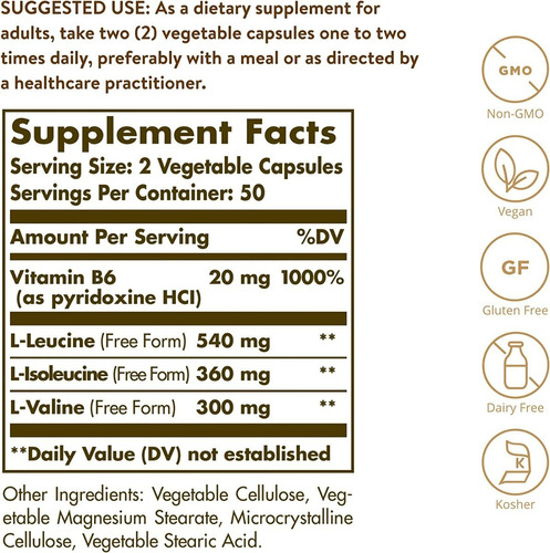 Metabolismo de aminoácidos; Solgar BCAA Plus también contiene vitamina B6, un factor importante en el metabolismo de aminoácidos
