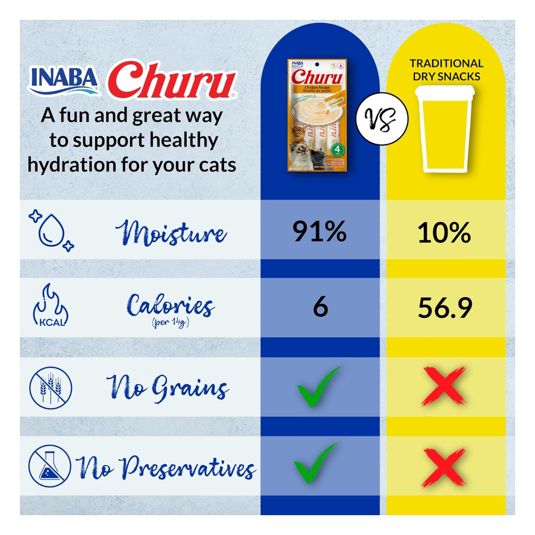 Churu™ Tuna es un snack para gatos de textura cremosa (puré) y alta palatabilidad. Tiene un alto contenido de humedad, contribuyendo a la hidratación del gato, con sabor de atún. Libre de granos, sin conservantes ni colorantes artificiales. Contiene 50 tubos de 14 g cada uno (700 g).