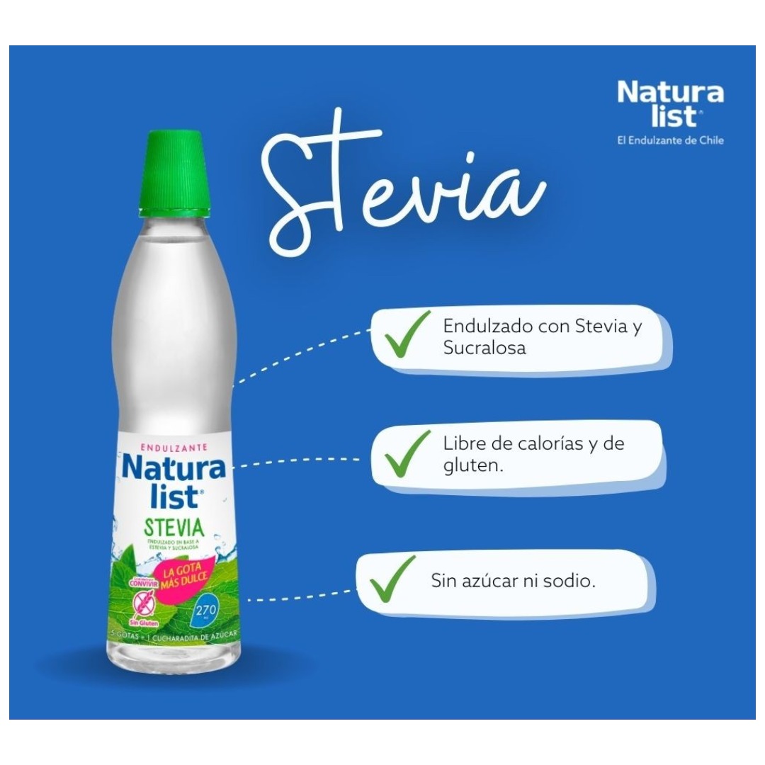 Úsalo en tus bebidas calientes y frías, para preparar postres, mousse, bavaroise, batidos, jugos, tragos y otros. 5 gotitas de Naturalist stevia líquida equivalen a 1 cucharadita de azúcar común. Producto sin gluten certificado por fundación convivir. Características: Endulzantes - Líquido - Sin gluten - Naturalist - Envase botella - Contenido 270 ml.