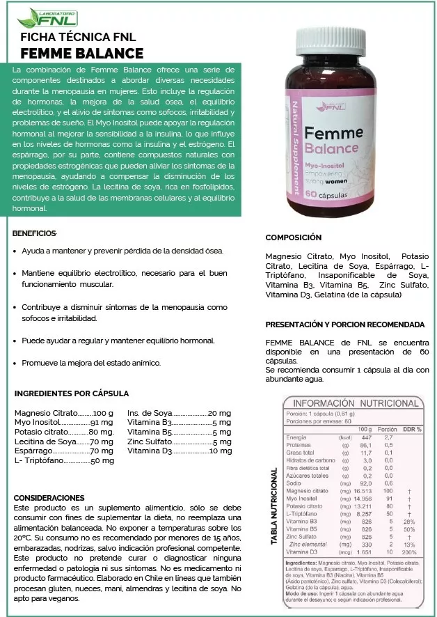 La combinación de Femme Balance ofrece una serie de componentes destinados a abordar diversas necesidades durante la menopausia en mujeres. Esto incluye la regulación de hormonas, la mejora de la salud ósea, el equilibrio electrolítico, y el alivio de síntomas como sofocos, irritabilidad y problemas de sueño.