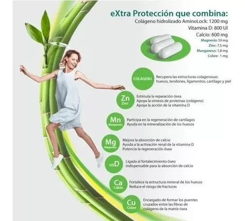 La porción diaria es de 3 cápsulas: 1200 mg de Colágeno Colágeno Hidrolizado con Tecnología Secuencial AminoLock, Vitamina D: 800 UI, Calcio: 600 mg, Magnesio: 50 mg, Zinc: 7,5 mg, Manganeso: 1,8 mg, Cobre: 1 mg