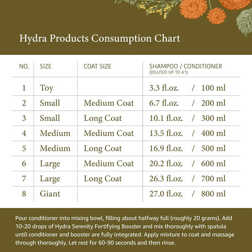 USO Y APLICACIÓN: Vierta el acondicionador en un tazón para mezclar, llenando aproximadamente a la mitad. Agregue de 10 a 20 gotas de Hydra Serenity Fortifying Booster y mezcle bien. Aplique la mezcla sobre la capa y masajee a través Déjelo reposar durante 60-90 segundos y luego enjuague.