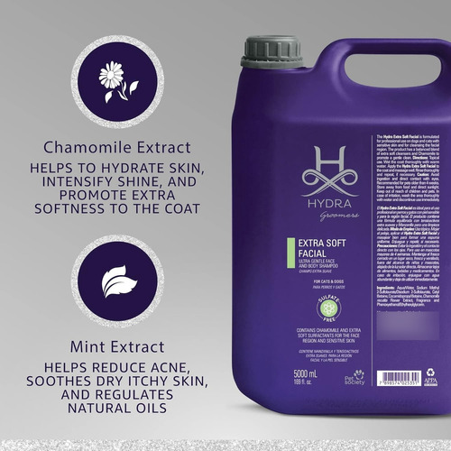 El Shampoo ultra suave Hydra de Pet Society está especialmente formulado para el uso profesional en perros y gatos con piel sensible.