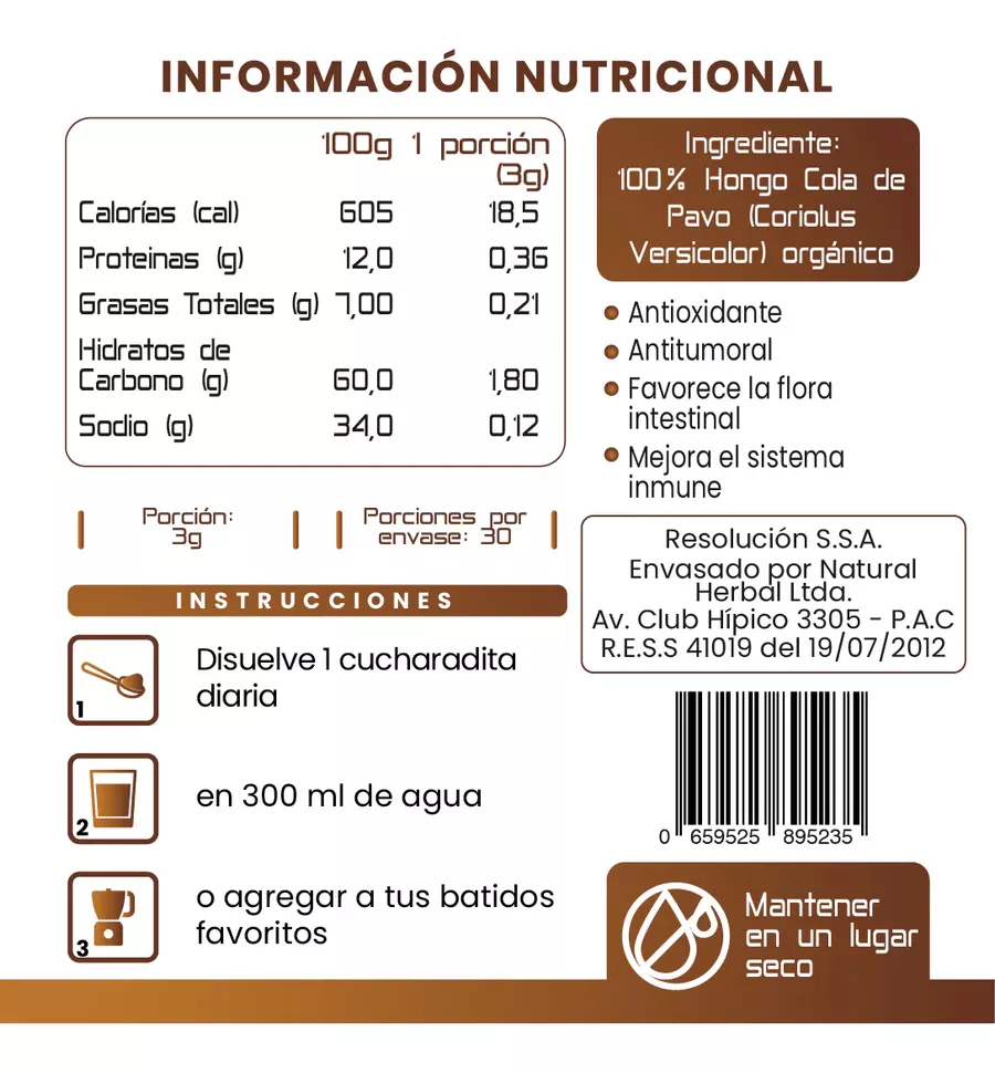 Paquete de 90g, 100% Turkey Tail en polvo, certificado. Se recomienda consumir 3g diarios en batidos o como infusión, preferentemente en la mañana, antes de romper el ayuno.