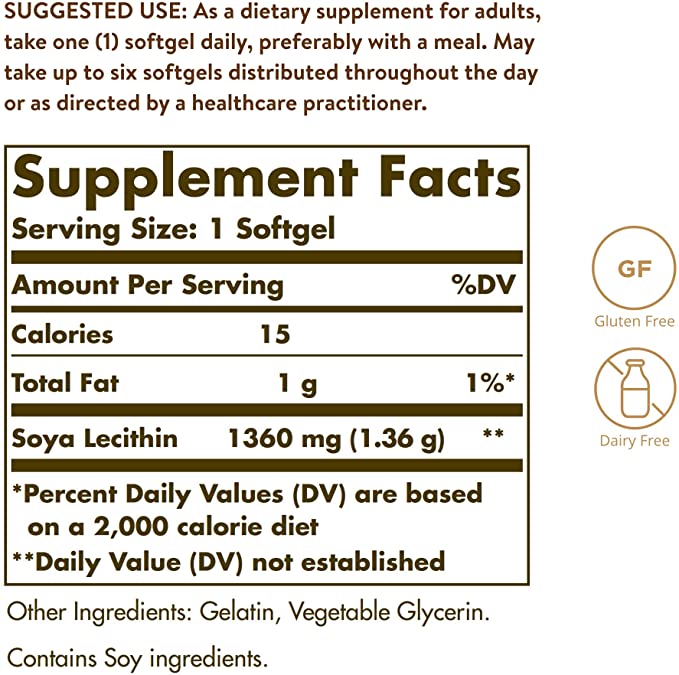 Sin gluten, trigo y lácteos; la lecitina Solgar está libre de: gluten, trigo, lácteos, levadura, azúcar, sodio, sabor artificial, edulcorante, conservantes y color