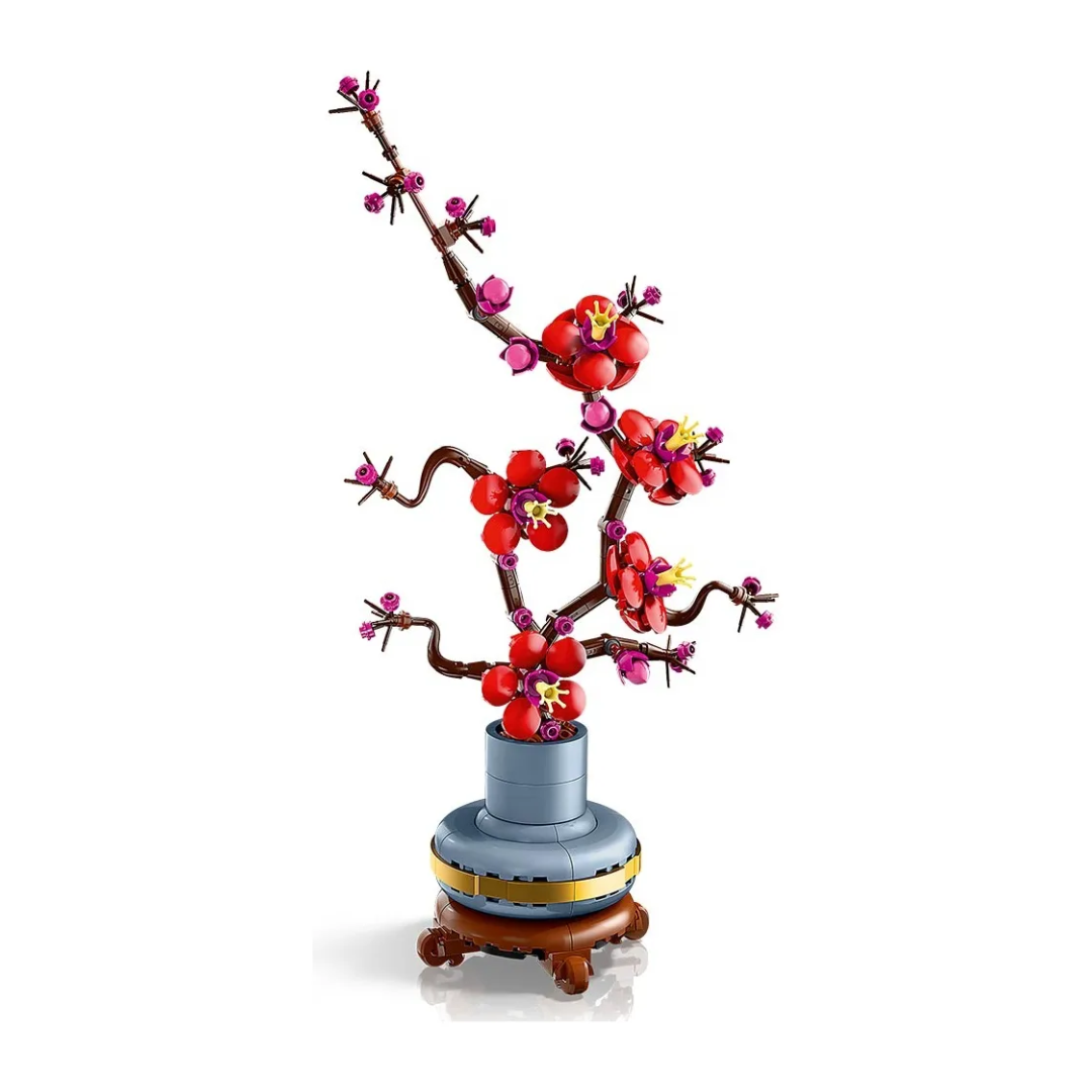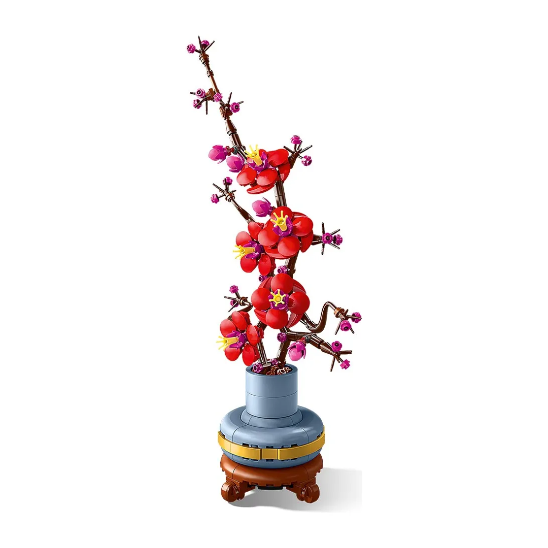 Construcción creativa para los amantes de las plantas: Este set de construcción creativa incluye todo lo que necesitas para ensamblar una flor de ciruelo, además de una maceta azul pastel con una banda dorada y una peana que imita la madera.
