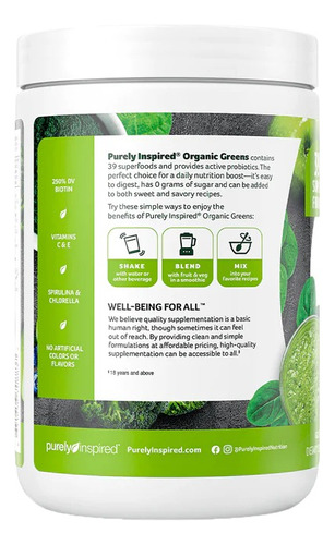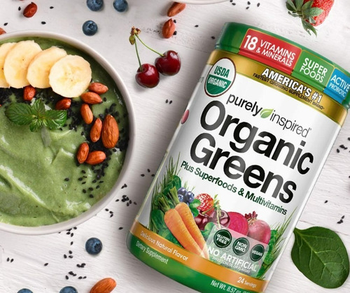 Purely Inspired Organic Greens Plus Superfoods & Multivitamins es una fórmula increíblemente pura que no contiene edulcorantes, saborizantes ni colorantes artificiales, para asegurar que usted solo incluya la mejor calidad de nutrición en su cuerpo.