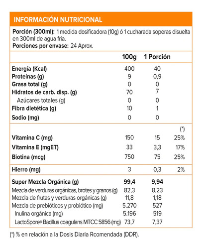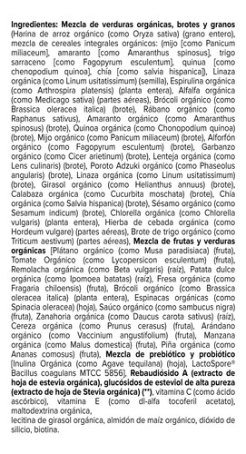 En una cucharada, con solo 35 calorías, obtendrás frutas y verduras, probióticos y 18 vitaminas y minerales. Este producto no solo está certificado por USDA Organic, sino que también es libre de gluten, no contiene ingredientes GMO y es 100% vegano.