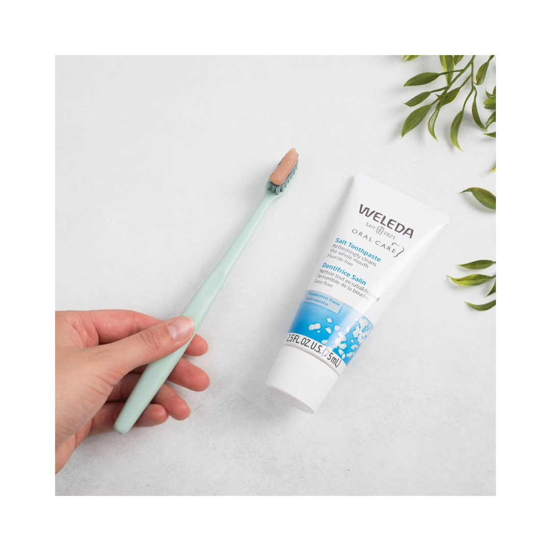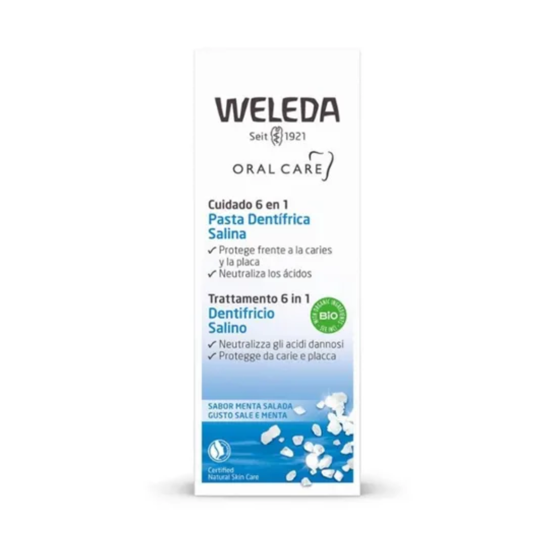 La sal marina tiene un efecto que estimula la salivación en la boca. En Weleda formulamos esta pasta dental salina para permitir que la saliva haga su trabajo natural, limpiando suavemente toda la boca. Los extractos naturales de raíz de ratania, mirra y corteza de castaño, tonifican las encías, mientras que las suaves partículas abrasivas limpian los dientes para evitar la formación de placa y sarro, protegiendo contra la formación de caries. El sabor ácido y salado es aún más refrescante con el aceite esencial de menta, para una limpieza dental fresca y sin flúor.