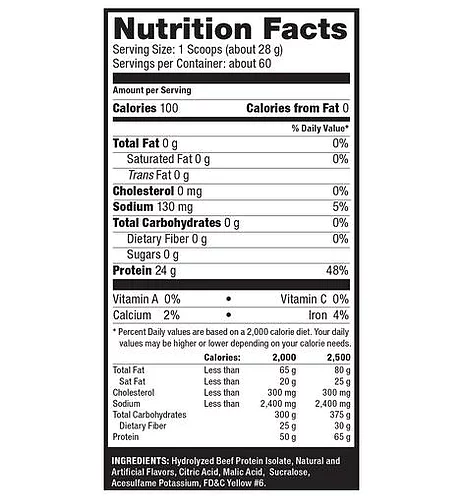 Aporta por porción sólo 100 calorías y un 86% de proteína de carne de vacuno de alta calidad (24 g de proteína aislada e hidrolizada). Además no contiene grasa, colesterol, carbohidratos ni azúcares. Es naturalmente libre de lactosa, soya, lacteos, hueno, mani y pescado.