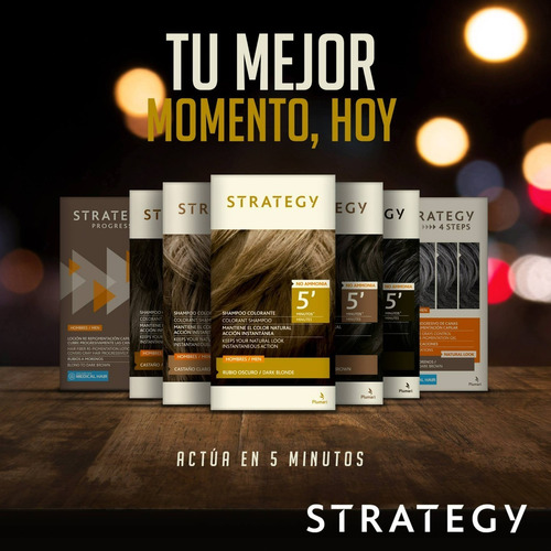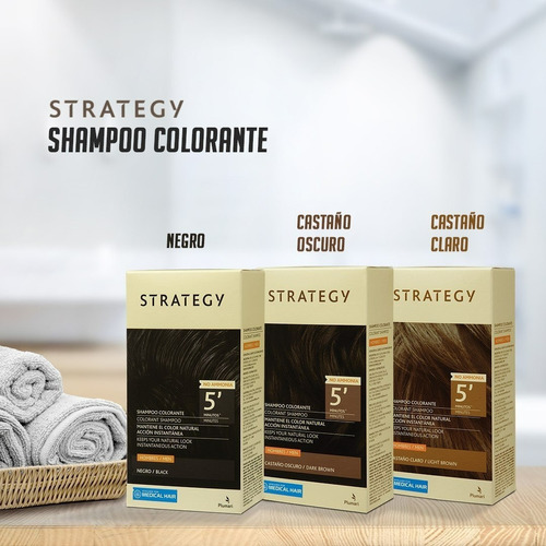 El Shampoo Color Castaño 5 Minutos de Strategy, mantiene el color natural del cabello y su acción es Instantánea, es muy fácil de usar, mezclas el Shampoo colorante en el Frasco Aplicador c/Revelador, y lo aplicas en la ducha, como si fuera un Shampoo normal, lo dejas 5 minutos, y ¡listo! Oscurece las canas de manera inmediata, pero se mantiene el Look Natural. El pelo NO se ve teñido, ya que deja algunas canas, lo que permite que no se note a primera vista el cambio. Para las mujeres se recomienda dejarlo unos 15 minutos. Hecho para Hombres: se puede aplicar en /Cabello/Bigote/Barba.