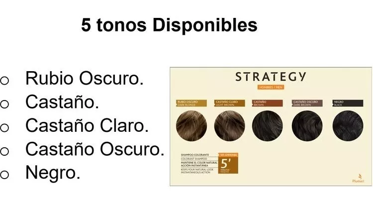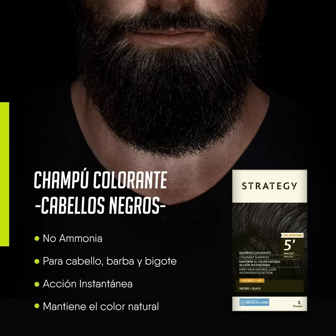 El Shampoo Efecto Inmediato de Strategy, mantiene el color natural del cabello y su acción es Instantánea, es muy fácil de usar, mezclas el Shampoo colorante en el Frasco Aplicador c/Revelador, y lo aplicas en la ducha, como si fuera un Shampoo normal, lo dejas 5 minutos, y ¡listo! Oscurece las canas de manera inmediata, pero se mantiene el Look Natural. El pelo NO se ve teñido, ya que deja algunas canas, lo que permite que no se note a primera vista el cambio. Para las mujeres se recomienda dejarlo unos 15 minutos. Hecho para Hombres: se puede aplicar en /Cabello/Bigote/Barba.