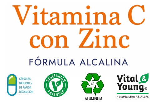 Los ingredientes de la VITAMINA C CON ZINC - FÓRMULA ALCALINA se importan, se formulan y encapsulan en Chile, y se envasan en frascos de aluminio 100% reciclable. Esta fórmula es libre de azúcar, gluten, lactosa, alérgenos y preservantes, y se encapsula en cápsulas naturales de rápida disolución Certificadas Kosher y Halal.